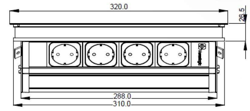 Kompletny system biurowy s 4 wtyczkami el., wraz z aluminiowym przepustem 320x120 mm i mocowaniem, które zazwyczaj umieszcza się na blacie stołu. W celu podłączenia do sieci elekt. należy zakupić kabel zasilający. Długość 2m (kod 179748) lub długość 3m (kod 179749). Rozmiar otworu: 311x111mm