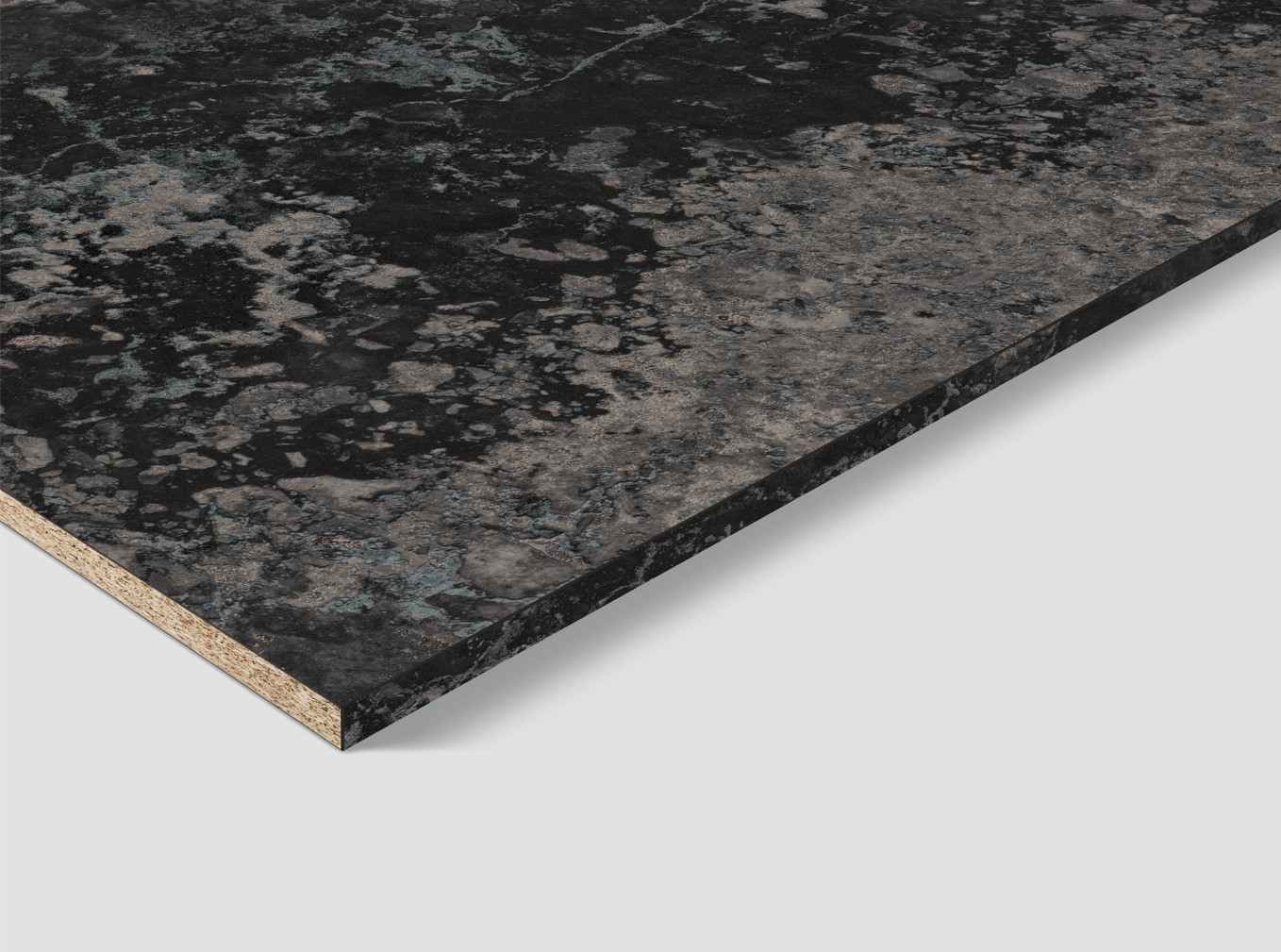 Pracovní deska PerfectSense Ambiance s rovnou hranou (ABS) pro kuchyňské linky a plochy pro přípravu jídel. Povrch PerfectSense Ambiance jedinečným způsobem kombinuje sametově matný vzhled řady PerfectSense s výraznými prvky zrcadlového lesku a autenticky napodobuje luxusní mramorové a žulové povrchy.