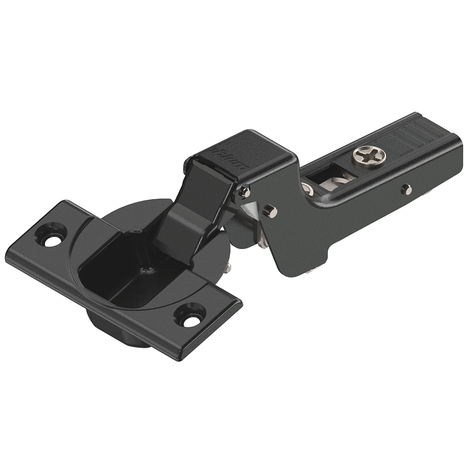 Wpuszczany zawias bez sprzężyny do Tip-On. Kąt otwarcia 110°. Montaż puszki na wkręt. Kolor czarny Onyx.