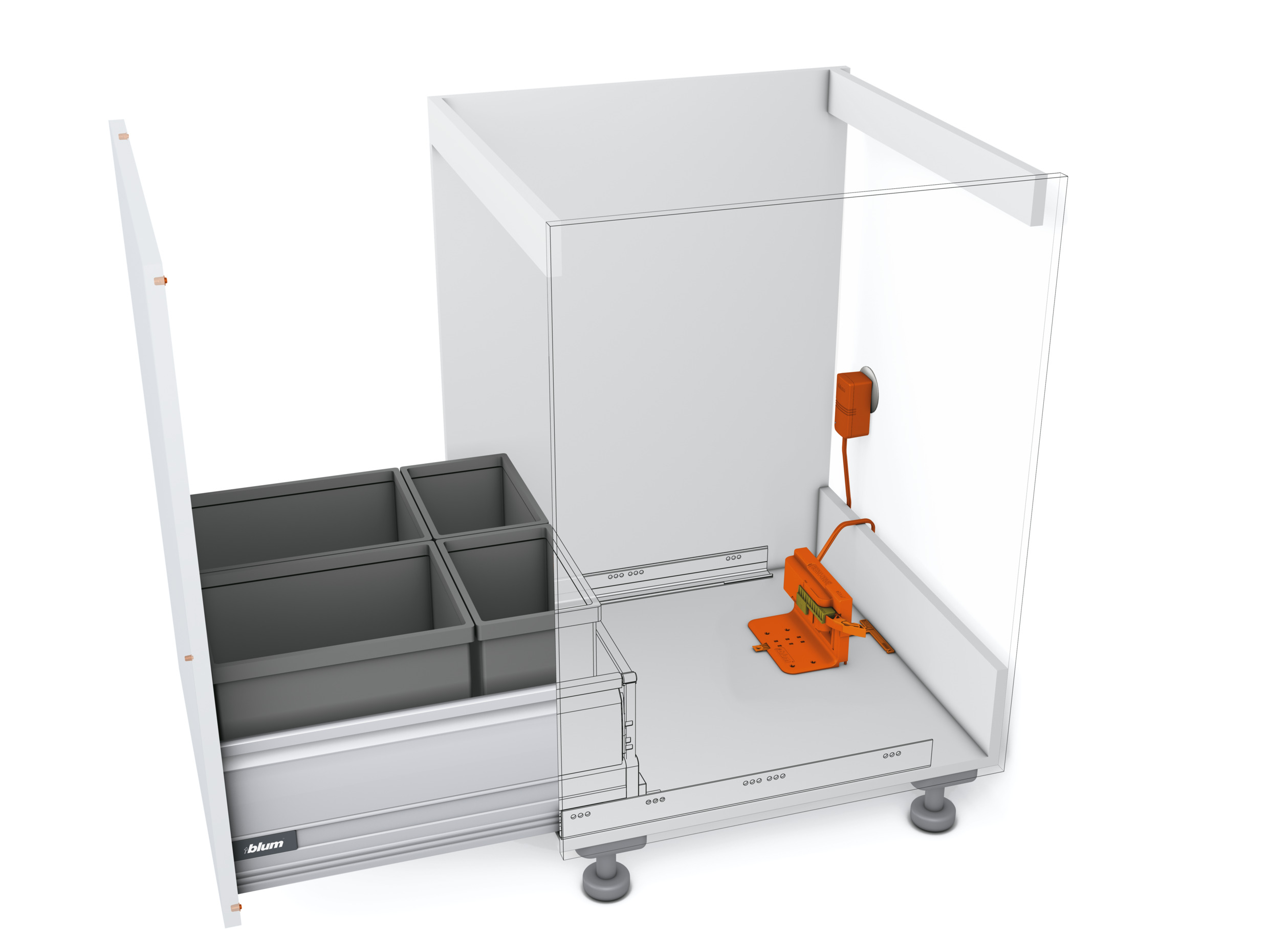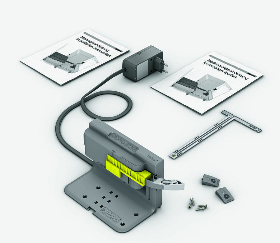 Komplet na 1 szufladę. Wykorzystanie szczególnie do szuflady z koszem na odpadki. Kpl zawiera: Nowe mocowanie servo napędu, jednostkę napędu, zaślepkę transp., ochrona przed kapiącą wodą, konektor do podłączenia sieciowego zasilania, adapter, kabel 110cm, instrukcję obsługi, dociągi, wkręty, instrukcję obsługi. UWAGA: Do tego zestawu (transformator) nie można podłączyć dodatkowych jednostek!