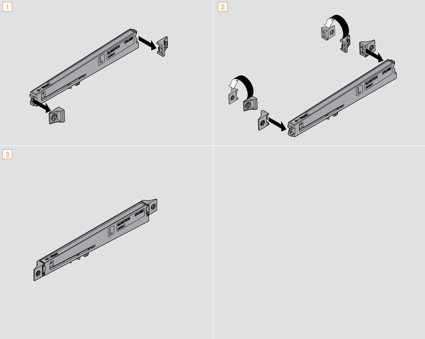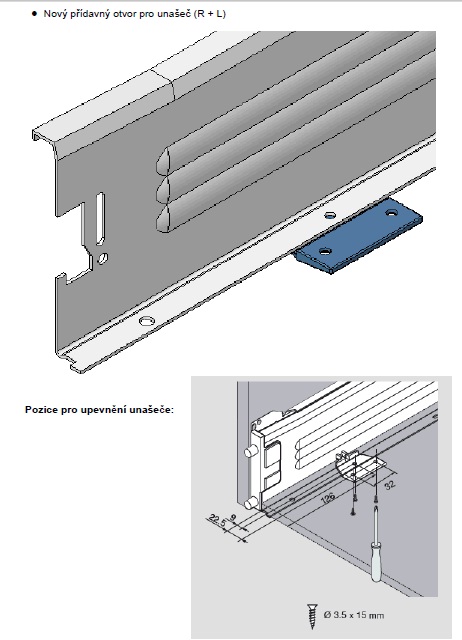 Tłumienie zewnętrzne dla systemu METABOX. W przypadku korpusów o szerokości do 900 mm wymagany jest tylko jeden element. Aby zapewnić prawidłowe działanie, należy go przymocować za pomocą dwóch śrub + nowego otworu w ścianie bocznej.