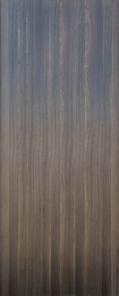 A strana - náhodné kresbové sesazování kouřového dubu, který se vyznačuje svou tmavě čokoládovou barvou. Náhodné kresbové sesazení vyváří souměrnou jedinečnost, kde se střídají tmavě hnědé odstíny přirozeného dubového dřeva.