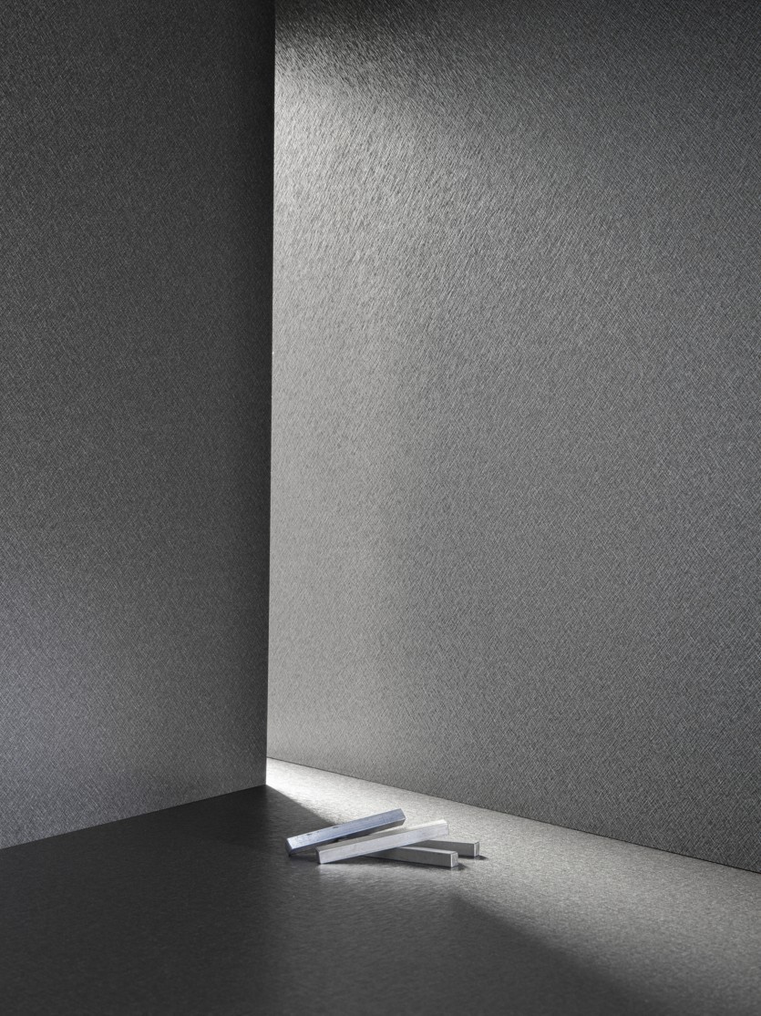 FB86 IDEA to ciemny metaliczny dekor z delikatną, niemal aksamitną patyną, przypominającą czarną przemysłową blachę z głębią i matowym połyskiem. Powierzchnia wygląda elegancko, ale jednocześnie surowo i technicznie — idealna do podkreślenia nowoczesnych wnętrz, które łączą ciepło drewna z chłodem metalu.