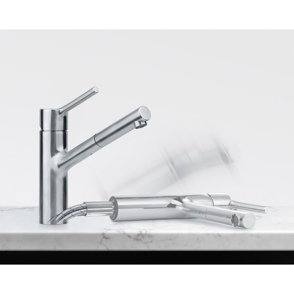 Samodzielna bateria zlewozmywakowa, przeznaczona pod okno, z możliwością przedłużenia i umieszczenia, konstrukcja ze stali nierdzewnej, wysokość 226 mm, wyciągana końcówka z perlatorem, otwór 35 mm, obrót o 120°. Kompletne akcesoria do montażu wchodzą w skład zestawu kran. Nie ma potrzeby kupowania czegokolwiek. 115.0596.384