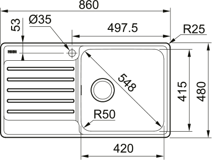 FRANKE Dřez BCX 211-86/7 nerez 860x480, sada ventilu + sifon, otvor pro baterii průměr 35 mm.