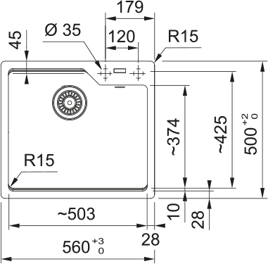 Výřez: 540 x 480 mm (Rádius 15 mm)