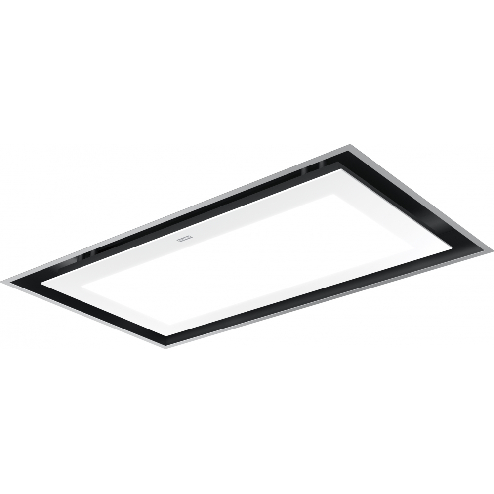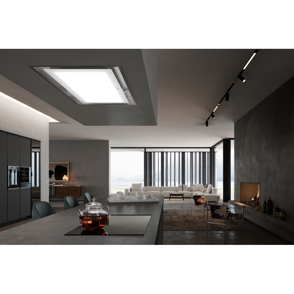 Wbudowany okap sufitowy Mythos Full Glass. Designerskie białe szkło, RAL 9010 w połączeniu z RAL 7042, rama ze stali nierdzewnej. Klasa energetyczna A. Sterowanie czujnikiem. Ssanie szczelinowe. 3 poziomy wydajności 2 × poziom intensywny. Nadrabianie zaległości. Wi-Fi, Bluetooth. Funkcja ciągłej wentylacji. Wskaźnik nasycenia filtra. Uwaga: cena bez opłaty recyklingowej. 350.0679.886