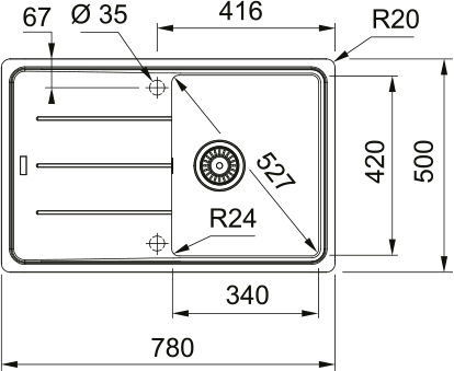 Cutout: 760 × 480 mm (Radius 20 mm)< br> Sink: 340 x 420 x 200 mm