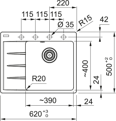 Dřez: 390 × 400 × 200 mm