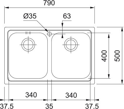 Dřezy: 2 × 340 × 400 × 185 mm