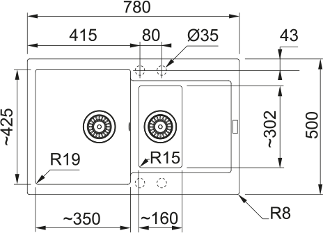 Sinks: 350 × 425 × 200 mm