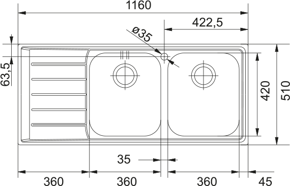 Dřezy: 2 × 360 × 420 × 200 mm
