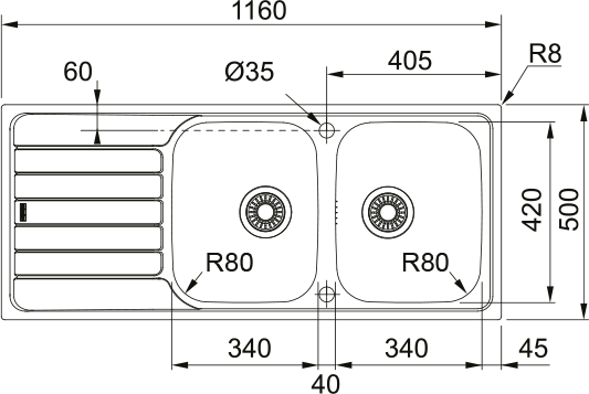 Dřezy: 2 × 340 × 420 × 160 mm