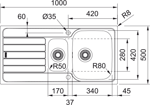 Dřezy: 340 × 420 × 160 mm