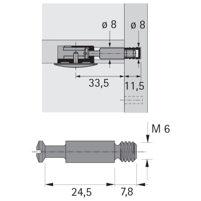 Trzpień wkręcany do okucia łączącego Rastex 25 do przykręcenia, gwint M6 x 7,8 mm, średnica wiercenia 8 mm. Rozmiar zapięcia 24,5 mm.