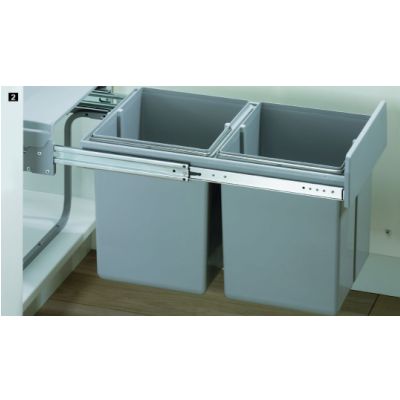 Do szafki szer. min.400 mm. Montaż na dno korpusu. System prowadnic pełnego wysuwu. Szerokość 338 mm, głębokość 485 mm, wysokość 385 mm. Komplet zawiera: 2 pojemniki 20 L, komplet okuć oraz pokrywę korpusu. Pojemnik + pokrywka: plastik szary.