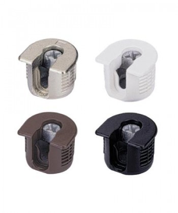 Mimośrodowe okucie łączące. Wkłada się do wywierconego otworu o średnicy 20 mm z góry, element nakładany jest na czop z góry. Poniklowany odlew cynkowy.