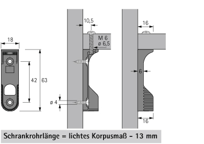 Do przykręcenia pod półką, ze specjalnym wkrętem M6 x 25, dodatkowo 2 otwory na wkręt do przykręcenia do boku korpusu.