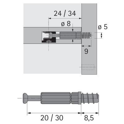 Kołek do przykręcenia. Eurogwint do średnicy wiercenia 5 mm. Rozmiar ucisku 30 mm. Stal cynkowana, czarny plastik.