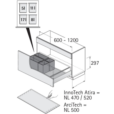 Do włożenia do szuflady InnoTech, długość 470 lub 520 mm. Szerokości szafki 600 - 1200 mm.Pojemność 41l. Wysokość montażowa 297 mm. Komplet zawiera: 4 pojemniki z wieczkiem- 1x17 l + 1x11l, + 1x8l, + 1x5l, 1 wycieraczka (można przyciąć).