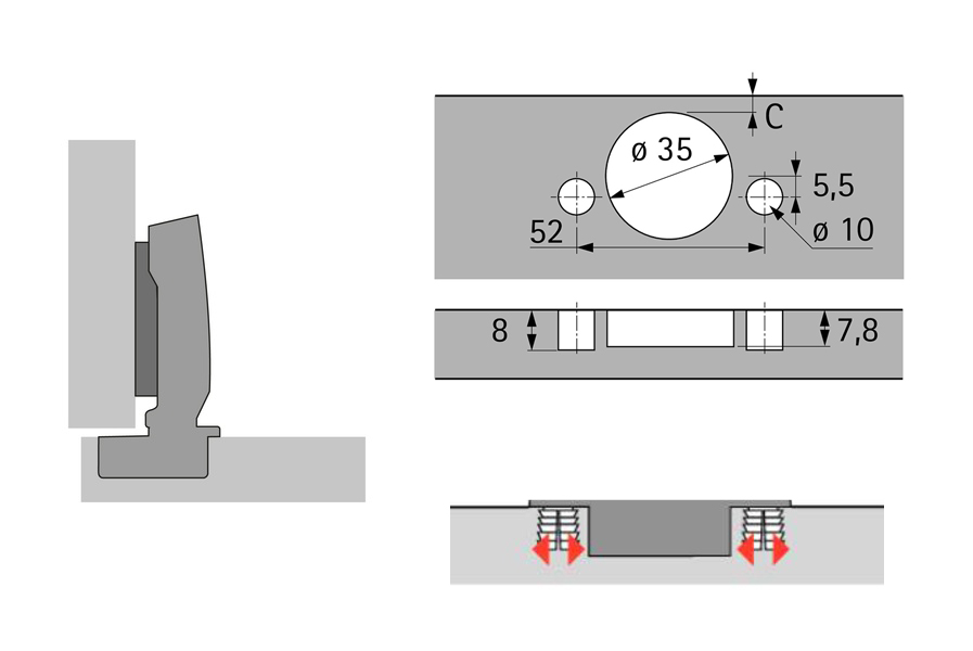Zawias z technologią klipsową i zintegrowanym tłumieniem. Do drzwi o grubości 10 - 19 mm. Średnica misy 35 mm Głębokość misy 7,8 mm. Zintegrowana regulacja załadunku + 2 mm, - 2 mm. Zintegrowana regulacja głębokości + 3 mm, - 2 mm. Regulacja wysokości z podkładką montażową. Materiał ramienia zawiasu: stal niklowana. Materiał puszki zawiasu: stal niklowana. Uwaga: Mocowanie zawiasu do drzwi należy dobrać w zależności od materiału i jakości oraz potwierdzić odpowiednim badaniem. Zalecane podkładki : D 1,5 dla śruby 106403 D 1,5 za euro 119240 Pokrywa miski nr 105408 i pokrywa wieszaka nr 105425 zamawiane są osobno.
