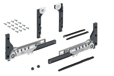 Do jednych drzwi z tłumieniem. Minimalna szerokość drzwi 450 mm. Zestaw zawiera: 2 x wózek z tłumieniem, 2 x element prowadzący, 2 x odbojnik, wkręty.