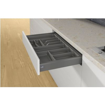 Wkład na sztućce OrgaTtay 440 (410). Głębokość 441-520mm. Uniwersalne wykorzystanie, możliwość regulacji wymiarów, nadaje sie do recyklingu, można wyposażyć mocowaniami na noże i pojemnikami na przyprawy, łatwy do utrzymania w czystości, wykończenie powierzchni w kolorze antracyt.
