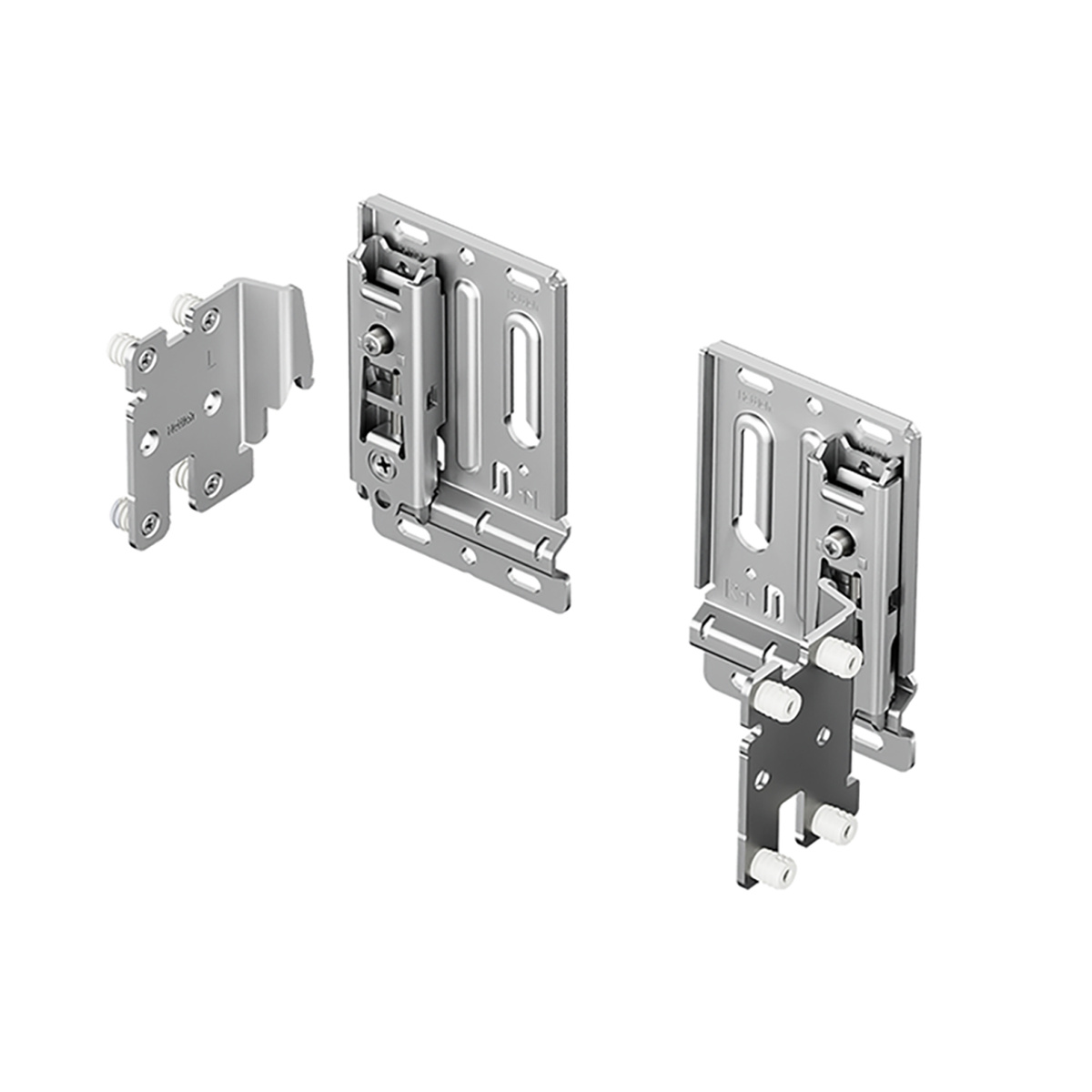 Zestaw zawieszek SAH 500 z blokadą przeciwko wypięciu. Składa się z elementu ściennego (L/P) oraz elementu korpusowego (L/P). Element ścienny przeznaczony jest do przykręcania do ściany – należy użyć materiału kotwiącego odpowiedniego do konstrukcji ściany. Element korpusowy jest przeznaczony do wciskania (automatyczny montaż) lub nasadzania na korpus (ręczny montaż). Zintegrowana blokada przeciwko wypięciu zapobiega niechcianemu zdjęciu szafki ze ściany (zgodnie z normą DIN EN 14749). Wysokość podniesienia potrzebna do zdjęcia korpusu z zawieszenia wynosi 6,5 mm.