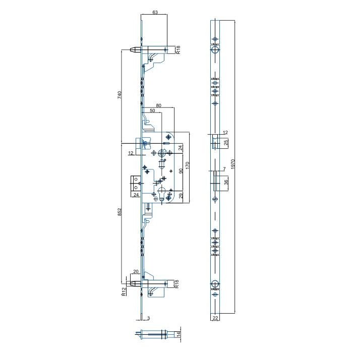 Zamek wpuszczany Hobes K119 z trzypunktowym zamykaniem o głębokości 80mm, odległość od osi 50mm, rozstaw 90mm, kolor cynk biały. W komplecie 1 klucz. Zamek z podwójną blokadą.Rozmiar frontu 1970*22mm. Strona prawa/lewa