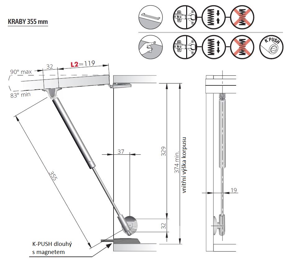 Podnośnik hydrauliczno-gazowy. Pomaga w otwieraniu drzwiczek i zarówno pozwala jednocześnie utzrymujac se w otwarte w różnych pozycjach. W przypadku zastosowania cienkiej ramki aluminiowej - adapter 15597 + samogwintujący wkręt 15598 2x i 15599 - 1x. Zalecamy stosowanie zestawów tłoków K-Push do bezuchwytowego otwierania. Zestawy z adapterem : z normalnym magnseme 227078,35000 - z bardzo mocnym magnesem 227080,350001. Zestawy do w wiercenia : z normalnym magnesem 227079- z bardzo mocnym magnsem 227081. APLIKACJA DO WYLICZANIA MOCY OKUĆ KRABY: KRABY>