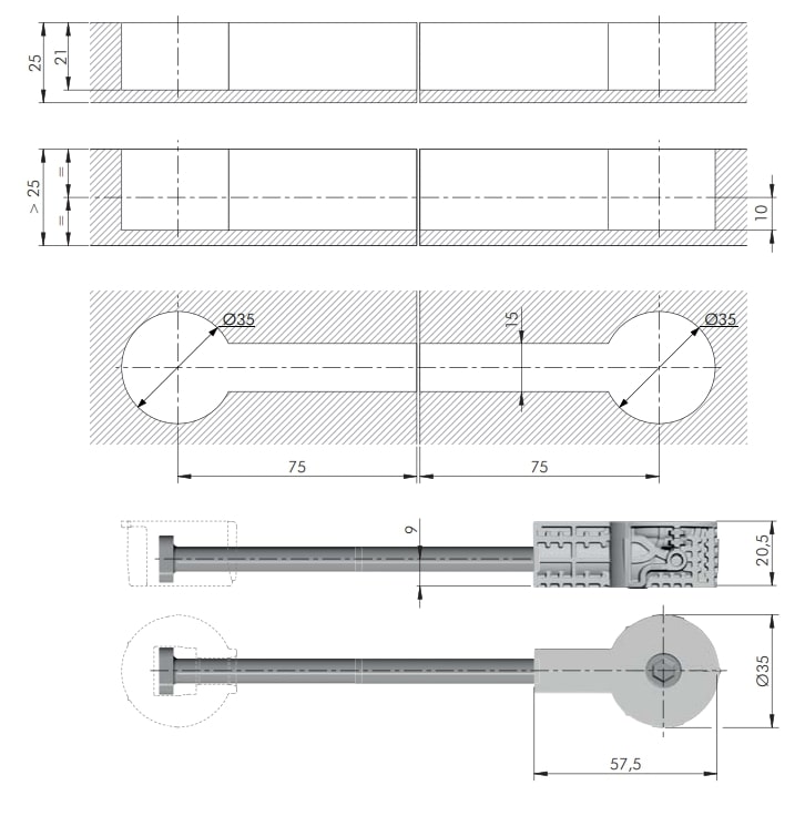 Minimalna grubość blatu - 25mm. Rozstaw (środek, średnica 35mm) 2x 75 -+ 0,3mm (150mm), szerokość rowka 15mm, wgłębienie 21mm.