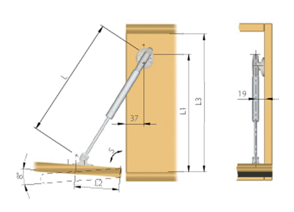 Podnośnik gazowy do dolnych drzwiczek (klap). Odpowiednie do drzwiczek o wysokości 401-450 mm, wagi poniżej 6,3 kg oraz maksymalnej szerokości 1200 mm. Zestaw zawiera mocowanie do korpusu i drzwiczek. W wypadku zastosowania wąskiej ramki aluminiowej należy zamówić adapter 15597 + wkręt samowiercący 15598 2x i 15599 - 1x. Maksymalna waga drzwiczek 4,9 kg.
