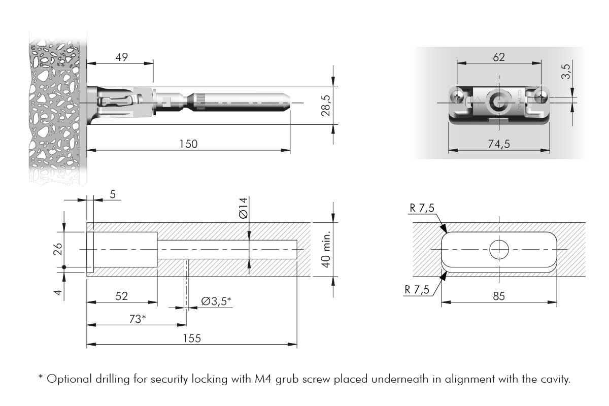 Obciążenie pary przy głębokości półki 400mm=40kg. Umożliwia trzystronną regulacjię - pionowa, boczna, regulacja kąta nachylenia Montaż do ściany na pomocą 2 kołków o śr. 8 mm i 2 śrub, rozstaw wiercenia 62 mm. Średnica bolca 14 mm, długość 94 mm, długość całkowita 150 mm. Przeznaczono na półki o min. grubości 40 mm i 200mm głębokości. BARDZO WAŻNE mocowania muszą być zawsze montowane z napisem "TOP-ALTO" na górze. Do łatwiejszego montażu można zamówić pomocniczy komplet do wiercenia - 405882 IF komplet przyżądów do wiercenia dla Triade Mini, Triade i triade Maxi.