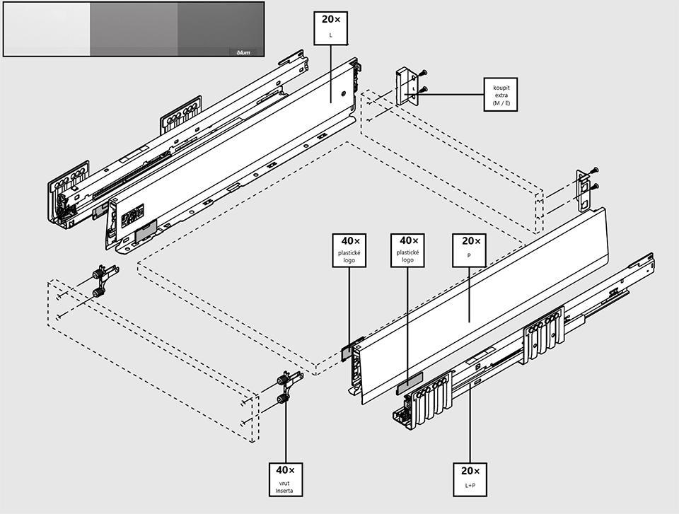 Zestaw do produkcji 20 szuflad Merivobox z miękkim domykaniem. W zależności od zakupionych akcesoriów (patrz poniżej) można łączyć szuflady o wysokości M i wysokości E.