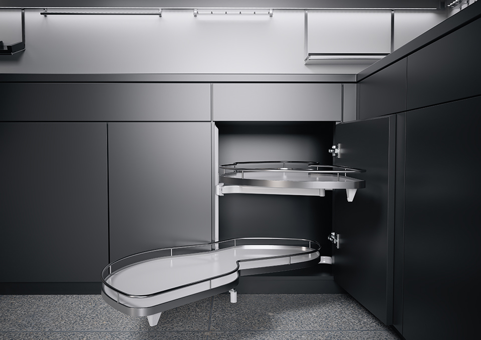 Dzięki specjalnie ukształtowanej geometrii półek, zwiększa rzeczywistą powierzchnię przechowywania nawet o 70%. To wyraźna przewaga nad porównywalnymi szafkami wysuwnymi. Jeśli LeMans II jest wyposażony w mechanizm tłumiący, który jest dostępny jako opcja, ruch półek jest prawie bezgłośny. Ten optymalny komfort można w każdej chwili szybko i łatwo zmodernizować.