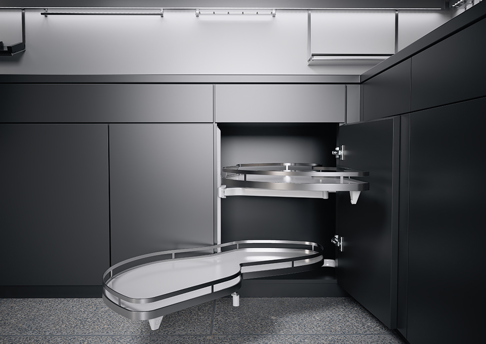 Dzięki specjalnie ukształtowanej geometrii półek, zwiększa rzeczywistą powierzchnię przechowywania nawet o 70%. To wyraźna przewaga nad porównywalnymi szafkami wysuwnymi. Jeśli LeMans II jest wyposażony w mechanizm tłumiący, który jest dostępny jako opcja, ruch półek jest prawie bezgłośny. Ten optymalny komfort można w każdej chwili szybko i łatwo zmodernizować.