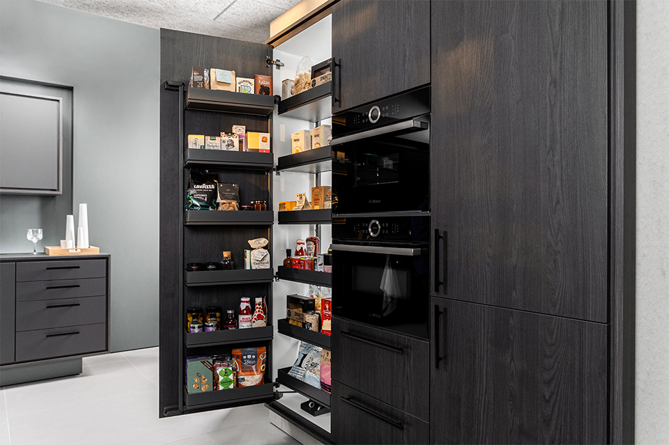 Kompletní sada kování pro výrobu potravinové skříně Tandem III, pro dveře i vnitřní část skříně. S koši ve variantě Arena Pure - antracit. Pro korpusovou šířku 600mm a světlou výšku 1700mm.