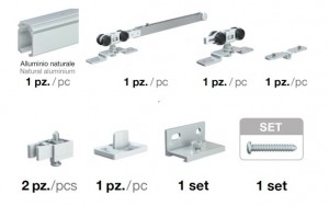 Zestaw okuć do drzwi wewnętrznych GALAXY. Zestaw zawiera 1x amortyzator, 1x hamulec, wózki i materiał łączący.Z prowadnicą Galaxy maksymalna waga skrzydła to 50kg.