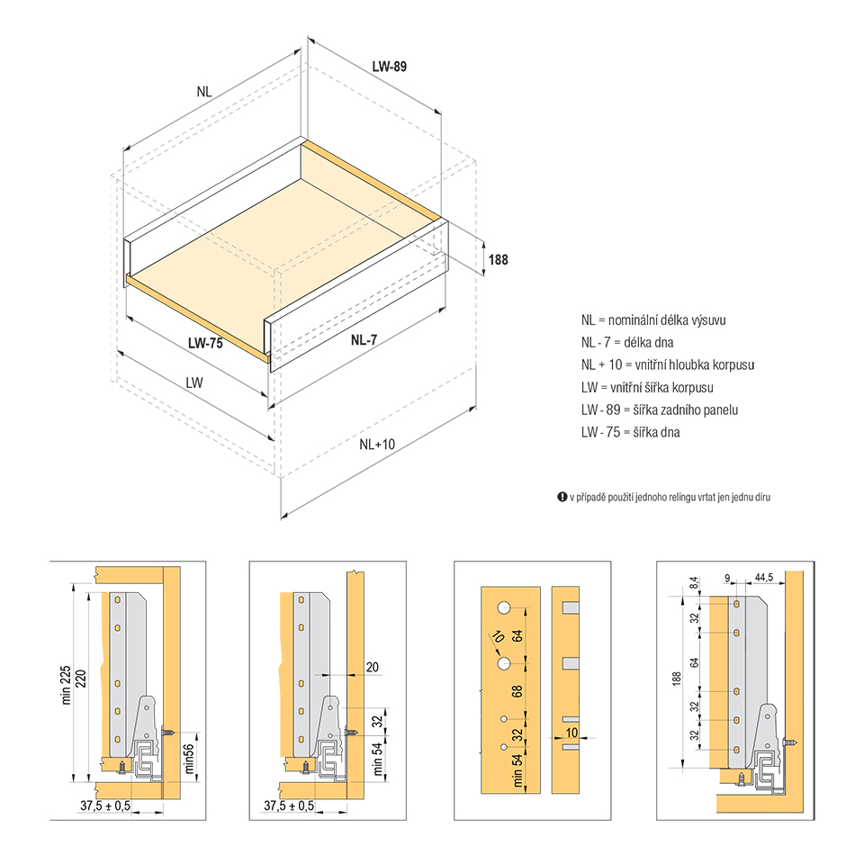 Prowadnica z tłumieniem i pustym bokiem wraz z 1 kpl. relingów kwadratowych. Długość 270mm, wysokość 204(225mm). Obciążenie do 35kg. Kolor biały. Wszystkie elementy potrzebne do skompletowania całej szuflady znajdują się w komplecie.