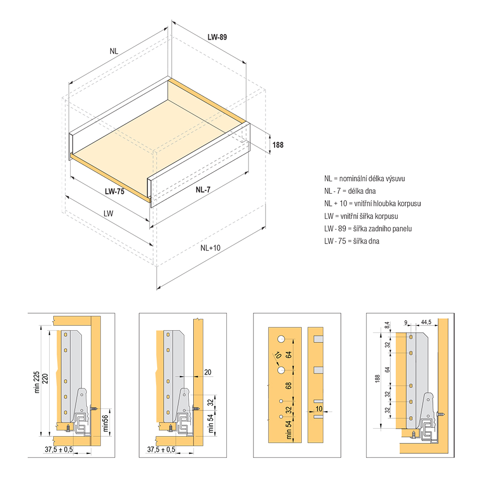 Prowadnica z tłumieniem i pustym bokiem wraz z 2 kpl. relingów kwadratowych. Długość 500mm, wysokość 204(225mm). Obciążenie do 35kg. Kolor szary. Wszystkie elementy potrzebne do skompletowania całej szuflady znajdują się w komplecie.