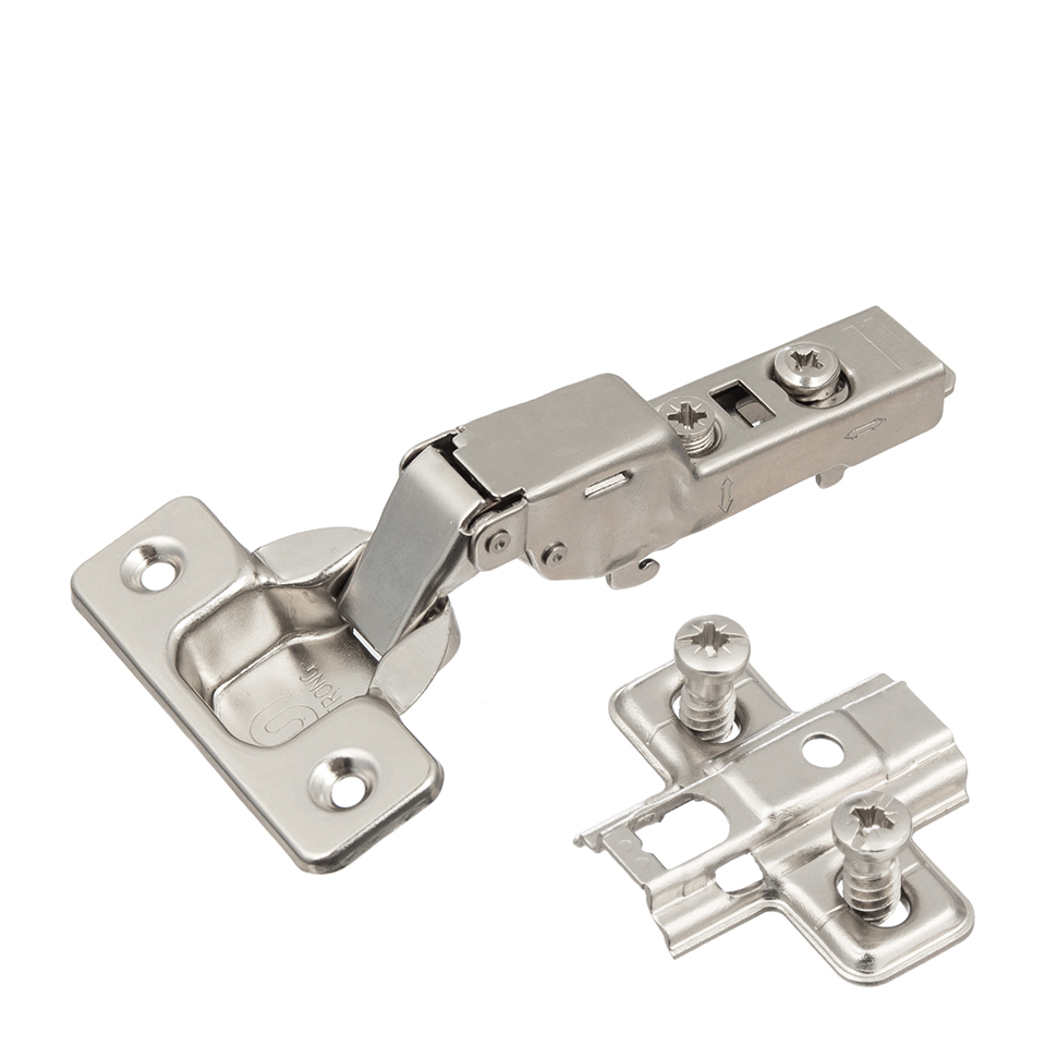 Kompletny zestaw zawiasu S3 z płytką montażową. Kąt otwarcia 110°, mocowanie puszki na wkręt oraz mimośrodowa regulacja głębokości.