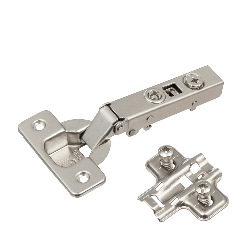 Kompletny zestaw zawiasu S5 z płytką montażową. Zawias z sprężyną domykającą (konstrukcja two-way), kąt otwarcia 110°, mocowanie puszki na wkręt oraz mimośrodowa regulacja głębokości.