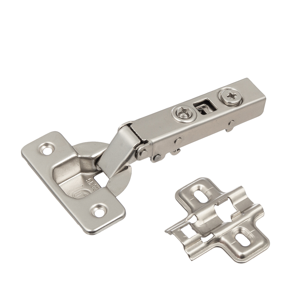 Kompletny zestaw zawiasu S5 z płytką montażową. Zawias z sprężyną domykającą (konstrukcja two-way), kąt otwarcia 110°, mocowanie puszki na wkręt oraz mimośrodowa regulacja głębokości.