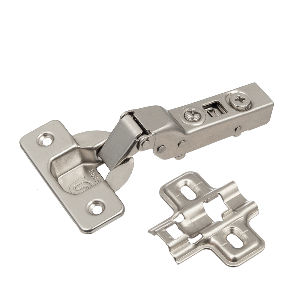 Kompletny zestaw zawiasu S5 z płytką montażową. Zawias z sprężyną domykającą (konstrukcja two-way), kąt otwarcia 110°, mocowanie puszki na wkręt oraz mimośrodowa regulacja głębokości.