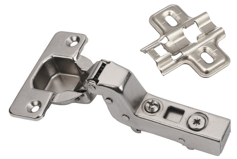 Kompletny zestaw zawiasu S5 z płytką montażową. Zawias z sprężyną domykającą (konstrukcja two-way), kąt otwarcia 110°, mocowanie puszki na wkręt oraz mimośrodowa regulacja głębokości.
