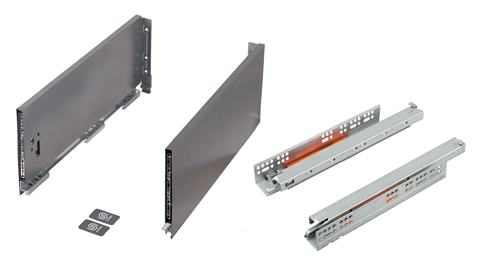 Kompletny zestaw okuć do złożenia szuflady StrongMax16. Należy uzupełnić o docięte elementy dna, pleców i frontu.