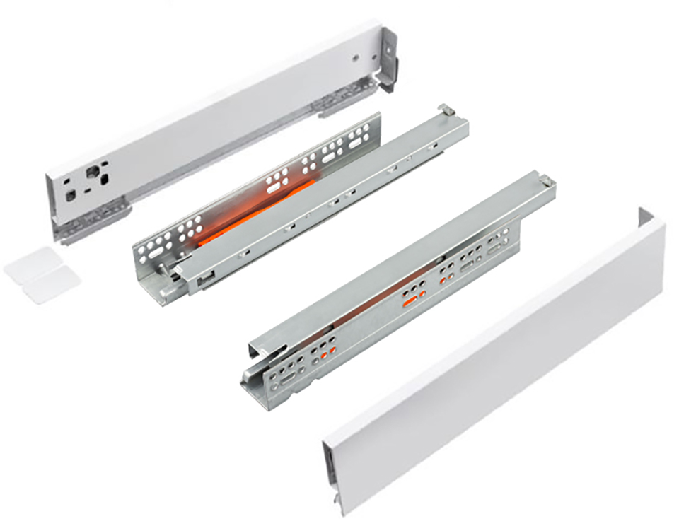 Kompletny zestaw okuć do złożenia szuflady StrongMax16. Należy uzupełnić o docięte elementy dna, pleców i frontu.