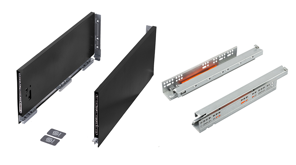 Kompletny zestaw okuć do szuflady StrongMax 18. W zestawie należy uzupełnić elementy: dno, tył oraz front.