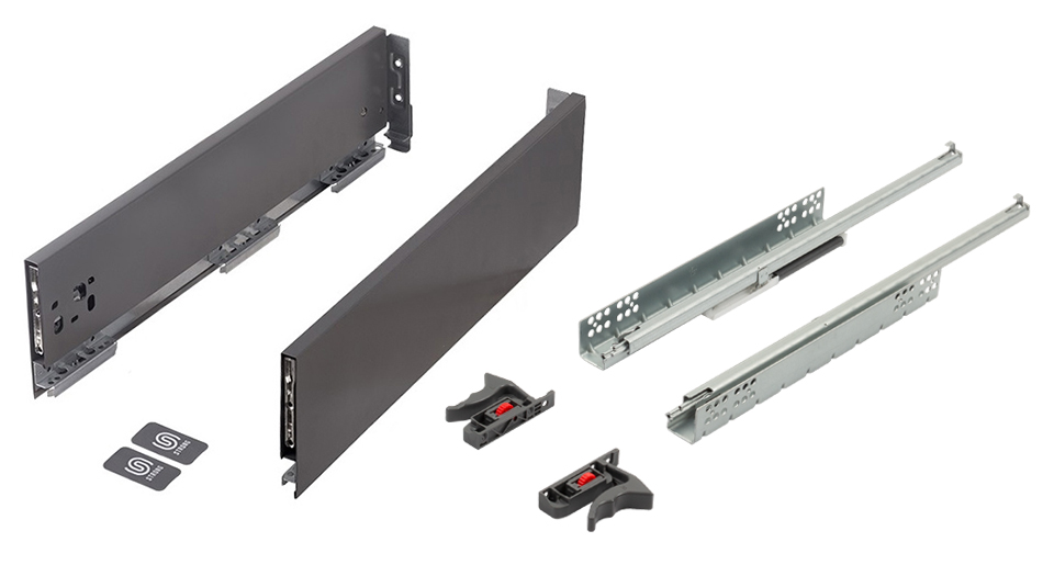 Kompletny zestaw okuć przeznaczony do złożenia szuflady StrongMax na ekonomicznych prowadnicach z pełnym wysuwem i cichym domykiem StrongRide Uni. Należy uzupełnić o przycięte elementy dna/tyłu oraz front. Grubość materiału dna/tyłu patrz nazwa kompletu (StrongMax Uni 16 / StrongMax Uni 18).