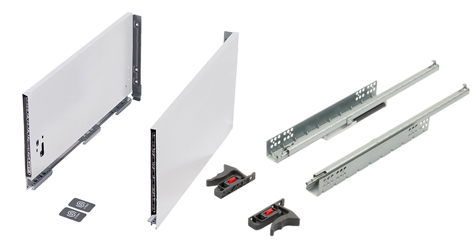Kompletny zestaw okuć przeznaczony do złożenia szuflady StrongMax na ekonomicznych prowadnicach z pełnym wysuwem i cichym domykiem StrongRide Uni. Należy uzupełnić o przycięte elementy dna/tyłu oraz front. Grubość materiału dna/tyłu patrz nazwa kompletu (StrongMax Uni 16 / StrongMax Uni 18).